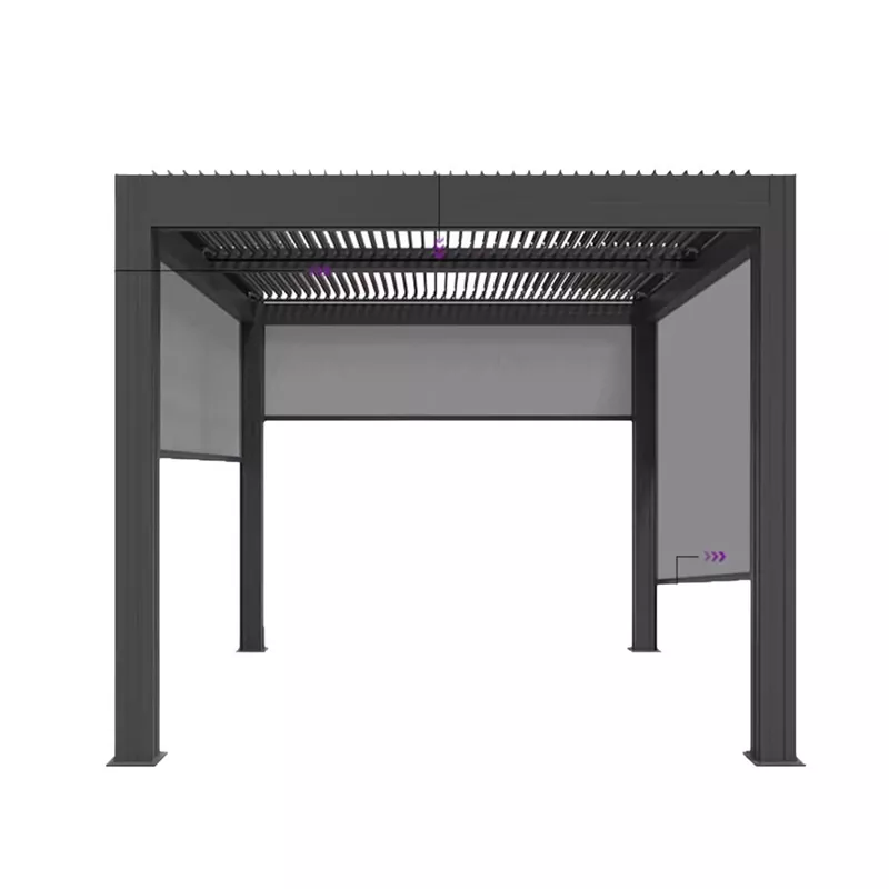 Avantajul principal al pavilionului de control inteligent constă în „estetica minimalistă + nucleu inteligent”. Bazat pe un design raționalizat al liniilor, integrează în mod invizibil module precum parasolar inteligent, iluminare și inducție a vântului și a ploii, păstrând aspectul minimalist transparent și îngrijit, realizând în același timp un control automat pe scenariu complet. Corpul principal este realizat din profile ușoare din aliaj de aluminiu cu acoperire mat cu fluorocarbon, echilibrând rezistența la intemperii, rezistența la coroziune și textura. Componentele inteligente adoptă un design rezistent la apă IP65, adaptându-se la mediile exterioare complexe. Poate fi controlat de la distanță prin APP și operat prin comenzi vocale, realizând funcții precum deschiderea și închiderea automată a parasolarului, schimbarea treptată a luminii și închiderea automată ca răspuns la vânt și ploaie, echilibrând confortul și simțul tehnologic.